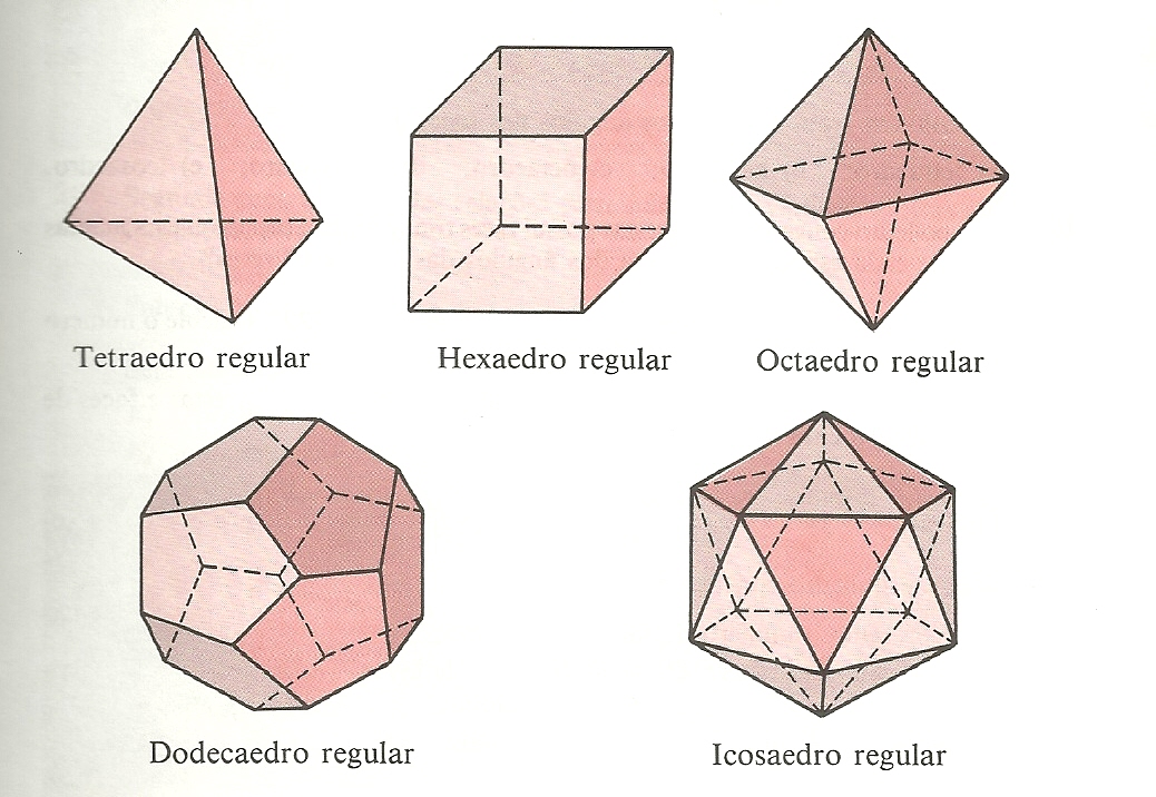 Existem 5 tipos de poliedros regulares : Tetraedro, Hexaedro, Octaedro, Dodecaedro e Icosaedro.
